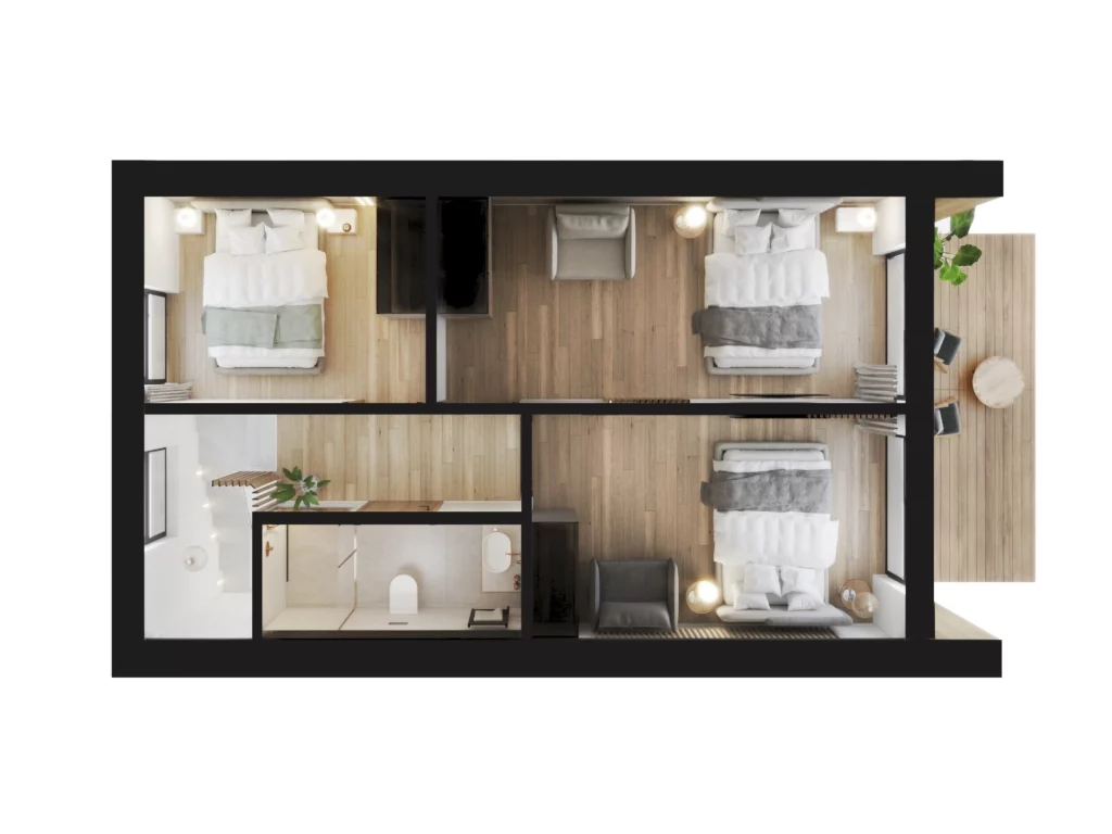 Całoroczny Domek w Sosnach to jeden z największych modeli w naszej ofercie, jego powierzchnia użytkowa wynosi 86 m2, nie odbiera mu to jednak ciepła i nastrojowości, a wysokiej jakości drewno użyte do budowy domu, nadaje mu cudowny mikroklimat. Dzięki zastosowaniu naturalnego budulca, posiadającego wysoką zdolność do magazynowania ciepła, uzyskujemy komfort cieplny, zarówno latem i zimą, co daje nam oszczędność rzędu 30% w porównaniu do domu murowanego. Parter składa się z dużego salonu wraz z aneksem kuchennym, małej toalety i pomieszczenia gospodarczego. Na piętrze znajdują się trzy przestronne sypialnie oraz łazienka. Całość jest pięknie przeszklona i wygląda bardzo nowocześnie, a pomieszczenia są jasne. Dom z drewna to alternatywa dla tradycyjnego budownictwa. Jego solidna konstrukcja, użycie specjalistycznej impregnacji czyni Domek w Sosnach, tak samo wytrzymałym, jak dom murowany. Może więc on pełnić funkcję miejsca wypoczynkowego, kompleksowego domku letniskowego lub nieruchomości rodzinnej, dostosowanej do indywidualnych potrzeb.