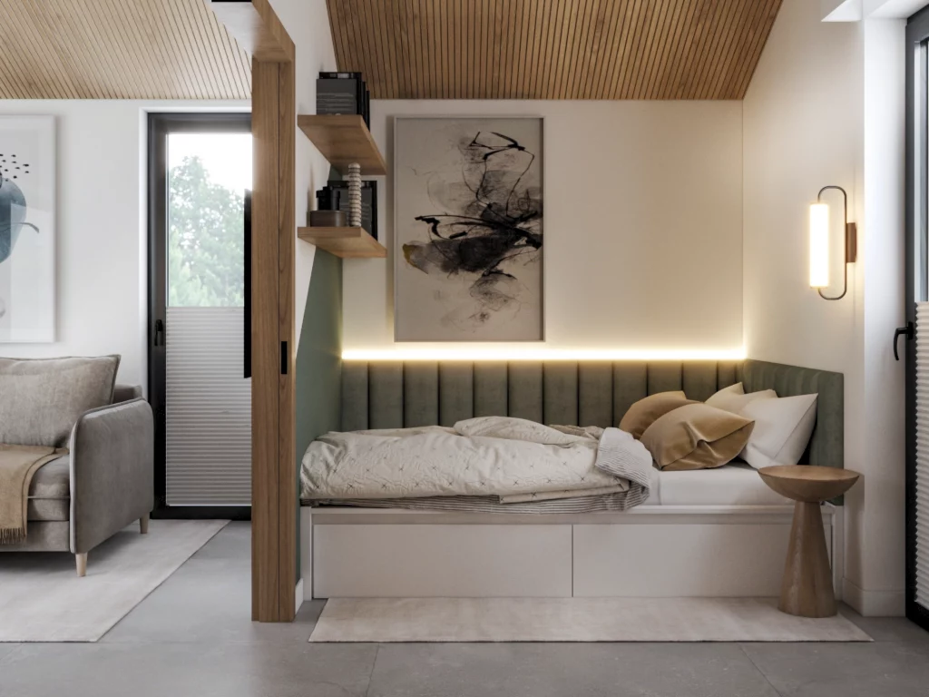 W związku z zapotrzebowaniem na małe parterowe domki, wprowadziliśmy do oferty projekt całorocznego domku o powierzchni użytkowej 27 m2. Wymiary domu nie wymagają uzyskania pozwolenia na budowę. Budynek składa się z salonu wraz aneksem kuchennym, sypialni oraz łazienki. Całość wykonana jest w systemie szkieletowym w konstrukcji drewnianej. Projekt jest nowoczesny, a zastosowane w nim roziązania, nadają mu cudowny mikroklimat. Jego właściwości termoizolacyjne, dzięki zastosowaniu drewna sosnowego, zapewniają idealny komfort cieplny. Latem można w nim odczuć przyjemny chłód, a zimą we wnętrzach panuje wyższa tremperatura. Prefabrykacja poszczególnych części Domku w Świerkach znacznie przyspiesza budowę, ułatwia montaż, a przede wszystkim prace wykończeniowe nie są skoplikowane. Ogromnym atutem budwonictwa szkieletowego jest również łatwość modernizacji i rozbudowy domku. Bez przeszkód można go zaaranżować, jako prywatny domek letniskowy, jak również poszerzyć skalę działań i stworzyć całe osiedle domków pod inwestycję. Rozwiązania technologiczne od Polish-Dom zapewniają solidną i trwałą konstrukcję, innowacyjna technologia szkieletowa to pewność najlepszych materiałów w atrakcyjnej cenie.